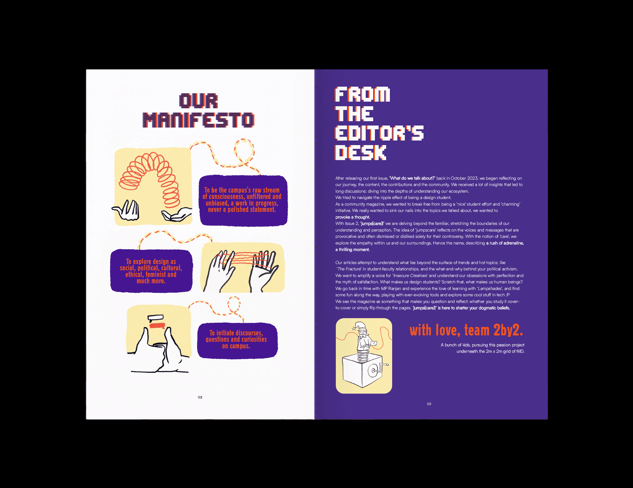 Jumps[Care], 2by2's second issue, reflects on the voices and messages that are provocative and often dismissed for their controversy, while the notion of ‘care’ explores ideas of empathy within and without. "Provoke thought and evoke change" is what its title implies.